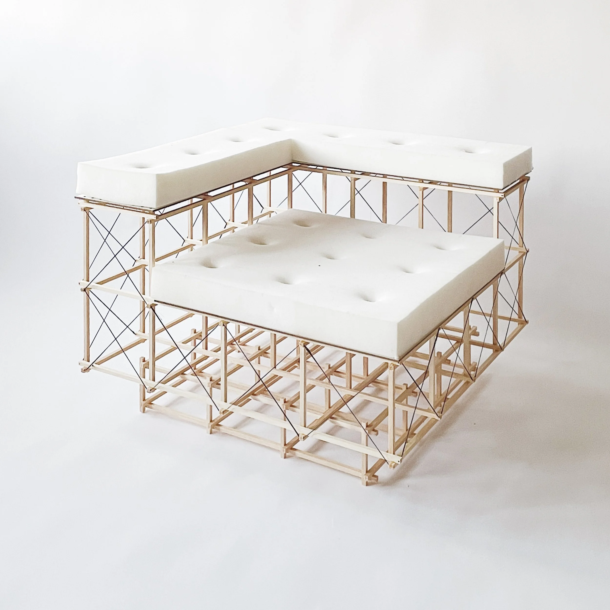 Materials: southern yellow pine, carbon fiber, perforated fiberboard, upholstery foam, steel hardware